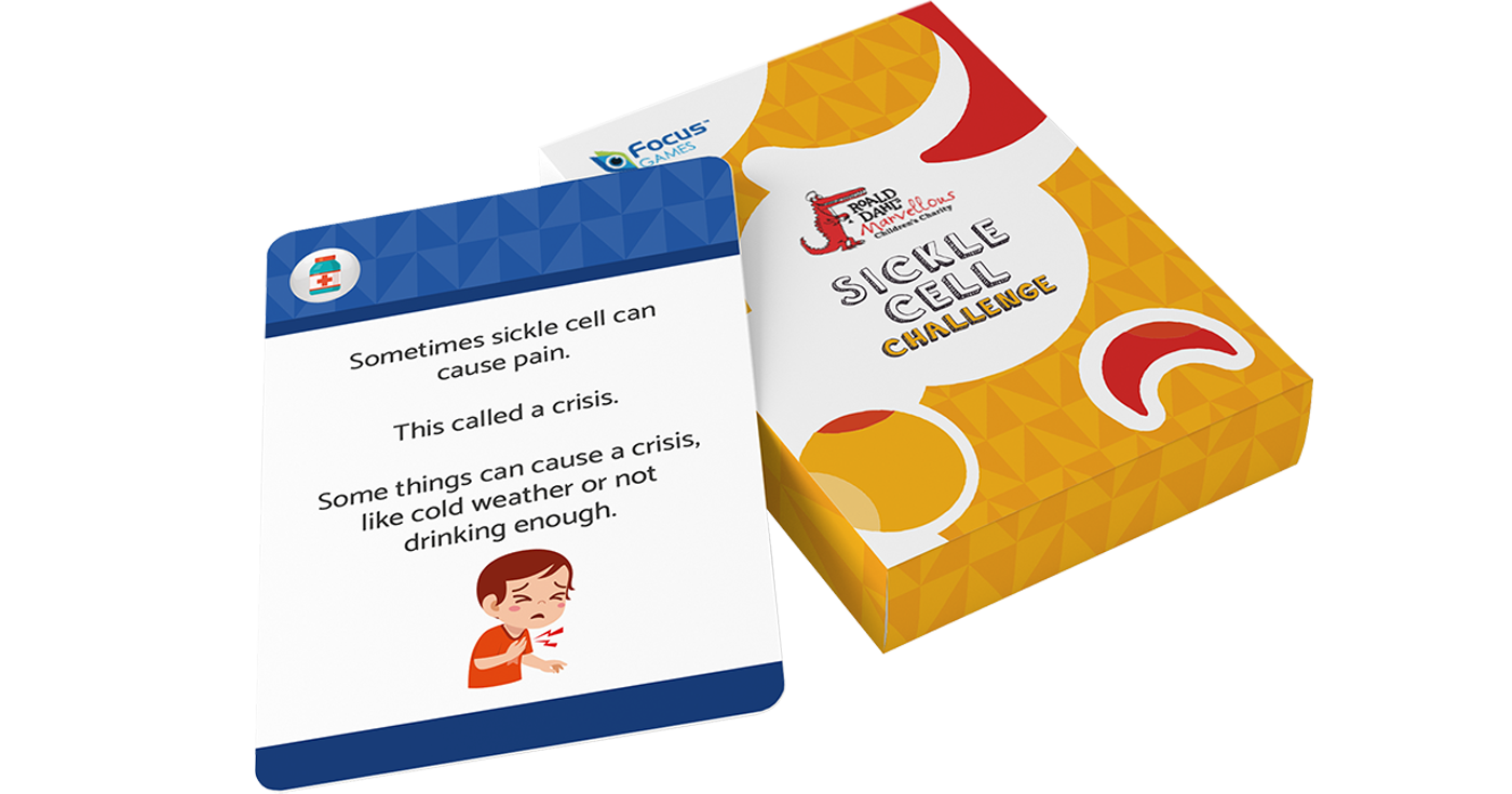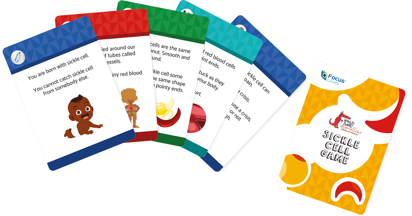 A simple educational card game that is fun but with a serious objective. It is designed to help children and families to learn more about sickle cell and how to manage it effectively. It presents information about keeping healthy, how medications work and how to avoid known triggers for a sickle cell crisis.